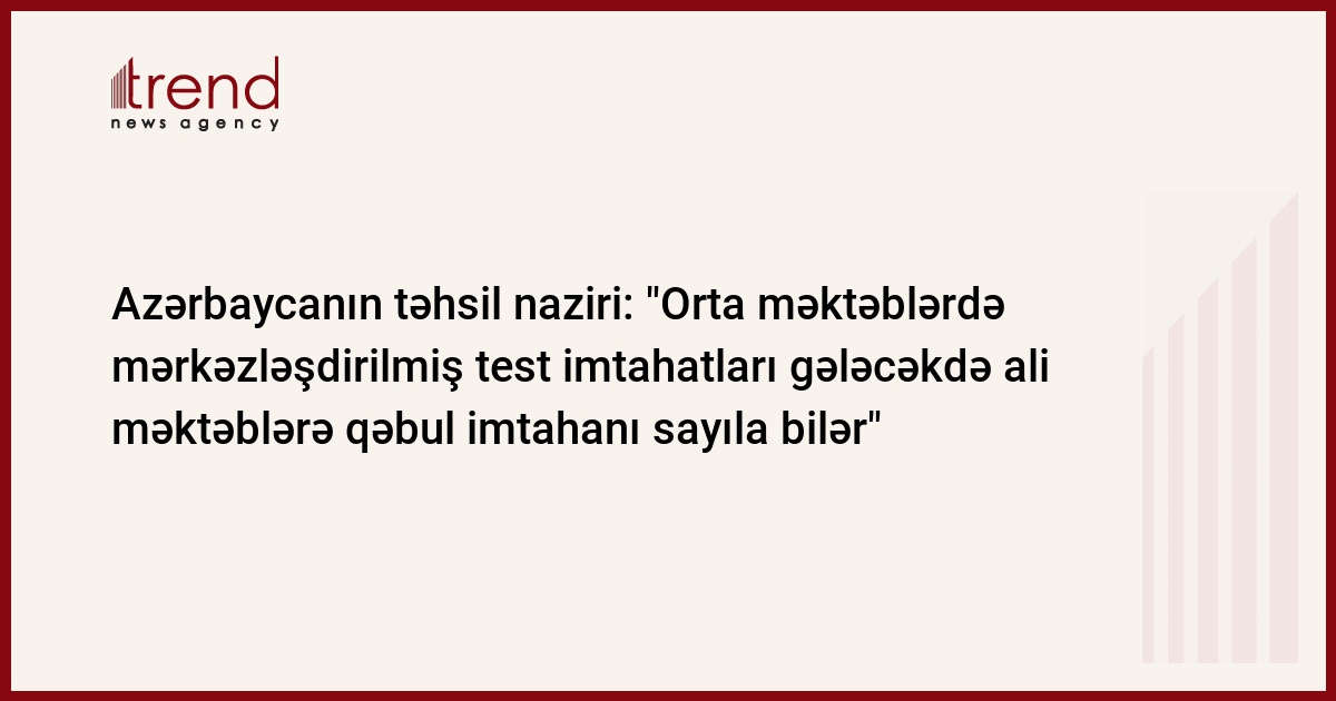 Azərbaycan, Bakı / Trend müxbir S.İlhamqızı/ Orta məktəblərdə mərkəzləşdirilmiş vahid test imtahatları gələcəkdə həm də ali məktəblərə qəbul imtahanı ola bilər. Bu barədə çərşənbə axşamı mətbuat konfransı keçirən Azərbaycanın təhsil naziri Misir Mərdənov açıqlama verib.