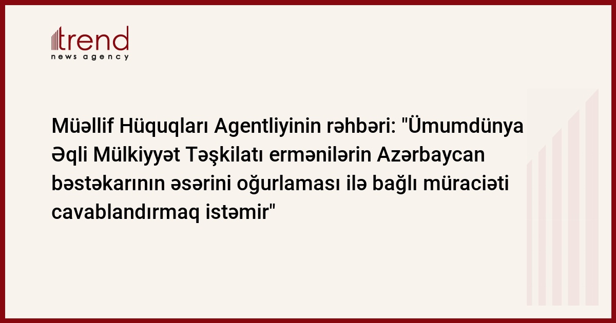 Azərbaycan, Bakı / Trend müxbir Ş.Əlizadə/ Ümumdünya Əqli Mülkiyyət Təşkilatı ermənilərin Azərbaycan bəstəkarı Fikrət Əmirovun "Kor ərəbin mahnısı" əsərini oğurlaması ilə bağlı Azərbaycan tərəfinin rəsmi müraciətini cavablandırmır. Bu bəyanatla cümə axşamı Respublika Müəllif Hüquqları Agentliyinin direktoru Abutalıb Səmədov çıxış edib.