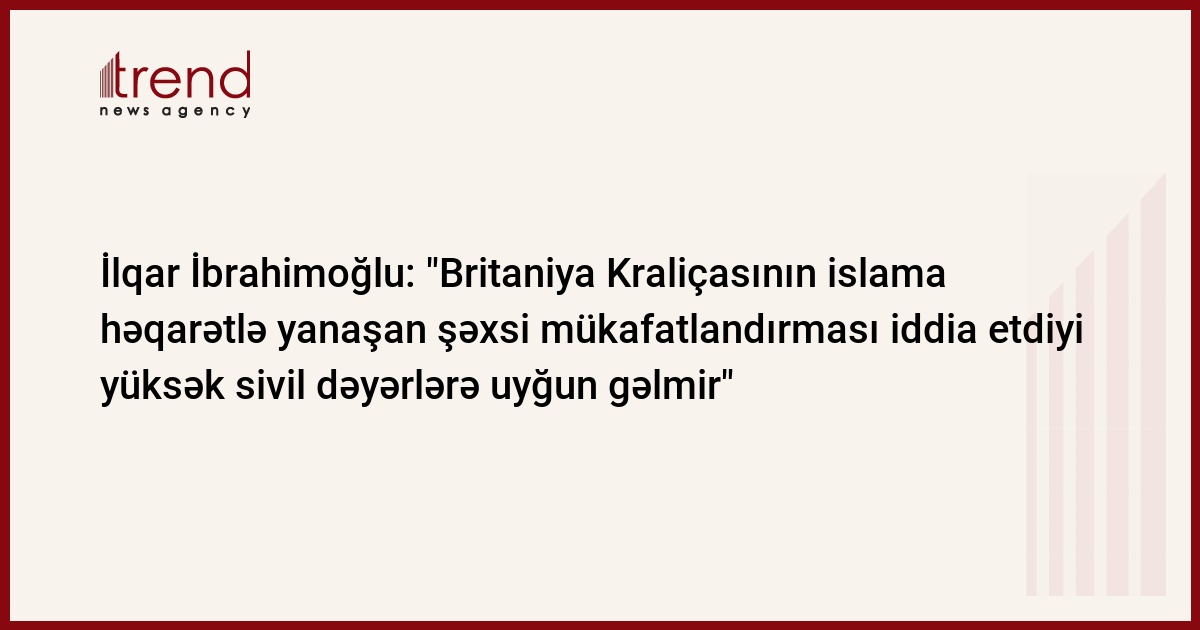 Azərbaycan, Bakı / Trend müxbir S.İlhamqızı/ İslam dininə həqarətlə yanaşan yazıçı Salman Rüşdünün Böyük Britaniya Kraliçası tərəfindən "Cəngavər ordeni" ilə təltif edilməsi islamofobiyanın genişlənməsinə rəvac verən addımdır. Dini Etiqad və Vicdan Azadlığının Müdafiəsi Mərkəzinin (DEVAMM) koordinatoru, din xadimi İlqar İbrahimoğlu bu barədə açıqlama verib.