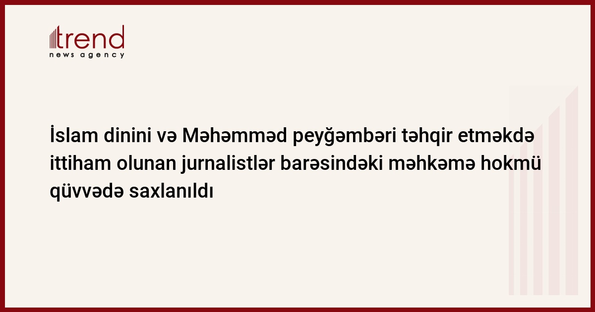Azərbaycan, Bakı / Trend müxbir K.Zərbalıyeva/ İslam dinini və Məhəmməd peyğəmbəri təhqir etməkdə ittiham olunan jurnalistlər barəsindəki məhkəmə hokmü qüvvədə saxlanıldı. Cümə günü Apellyasiya Məhkəməsində hakim Rəsul Səfərovun sədrliyi ilə keçirilən məhkəmə prosesində dövlət ittihamçısı Möhbalı Qurbanov çıxış edərək "Sənət" qəzetinin baş redaktoru Samir Sədaqətoğlu və yazarı Rafiq Tağının barəsində çıxarılan cəzanın dəyişdirilməməsini və apellyasiya şikayətinin rədd olunmasını məhkəmədən xahiş edib.