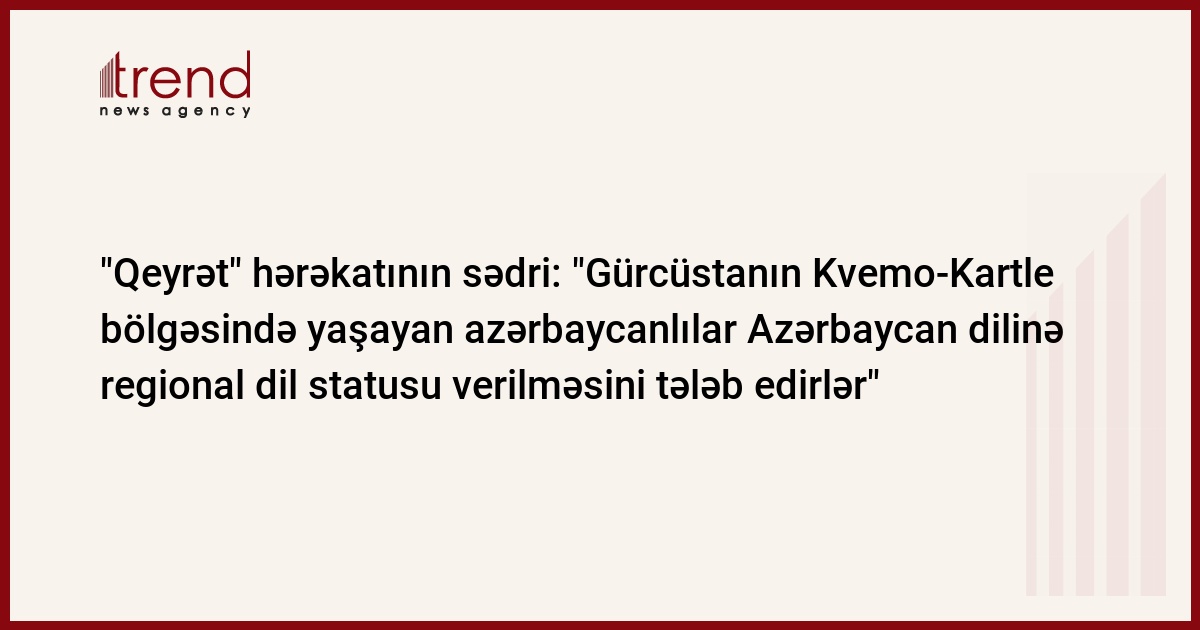 "Avropa Şurasının qəbul etdiyi qərara görə, bir bölgədə yaşayan hər hansı bir etnik xalqın sayı həmin bölgənin ümumi əhalisinin 51 faizini təşkil edirsə onların istifadə etdikləri dilə regional dil statusu verilə bilər. Borçalıda yaşayan azərbaycanlılar bölgə əhalisinin 50 faizindən çoxunu təşkil edir. Ona görə də bizim bugünkü əsas tələbimiz Azərbaycan dilinə regional dil statusunun verilməsidir" - deyə hərəkat sədri əlavə edib.