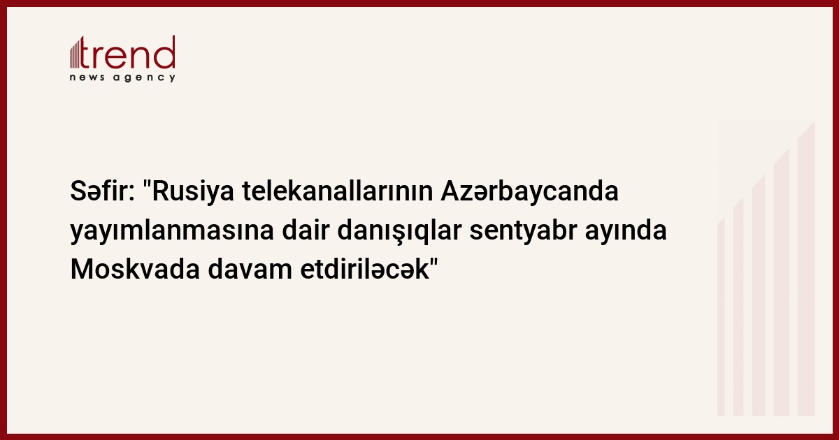 Azərbaycan, Bakı / Trend , müxbir A. Qasımova/ Sentyabr ayında Moskvada Rusiya telekanallarının Azərbaycanda yayımlanmasının davam etdirilməsi ilə bağlı danışıqlar keçiriləcək. "Rusiya kanallarının yayımlanması ilə bağlı danışıqlar üzrə Əlaqə qrupunun görüşünün növbəti mərhələsi sentyabrın əvvəlində və ya ortalarında keçiriləcək" - deyə bu gün Rusiyanın Azərbaycandakı səfiri Vasiliy İstratov Bakıda keçirilən mətbuat konfransında bildirib.