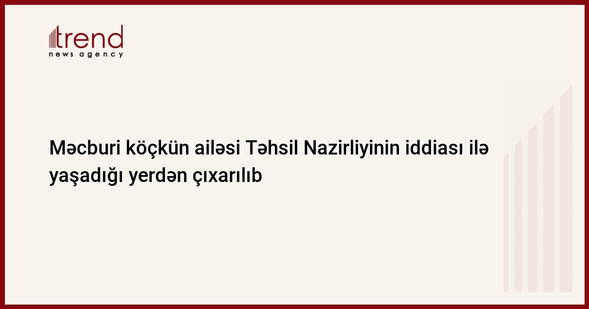 Azərbaycan, Bakı/ Trend , müxbir K.Zərbalıyeva/ Şuşadan məcburi köçkün düşmüş müəllimin ailəsi Təhsil Nazirliyinin iddiası ilə yaşadığı yerdən çıxarılıb. Yasamal rayonundakı 20 saylı orta məktəbin ərzisində məskunlaşmış Validə Bağırovanın ailəsi məhkəmənin qərarı ilə 18 saylı bağçada onlar üçün ayrılmış otaqlarda məskunlaşıblar. Bağırovanın vəkili Famil Məmmədov cümə günü Trend ə bildirib ki, məcburi köçkün ailəsi bağçada onlara ayrılmış otaqlarda aparılan təmirlə razı deyil. Təmirin aşağı səviyyədə aparıldığını deyən vəkil Yasamal rayon məhkəməsinin qətnaməsindən apellyasiya şikayəti verildiyini bildirib.