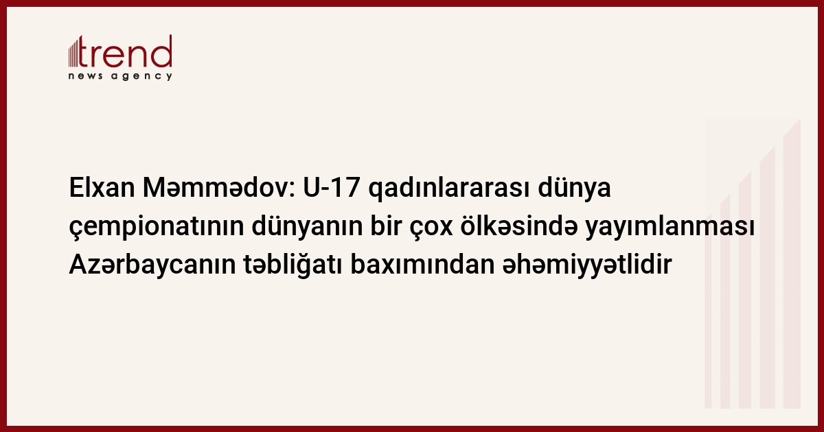 "Mundialın oyunlarının dünyanın bir çox ölkəsində yayımlanması beynəlxalq aləmdə ölkəmizin təbliğatının aparılması baxımından da xüsusi əhəmiyyət kəsb edir", - Trend-in məlumatına görə, bu fikirləri AFFA-nın baş katibi, FİFA U-17 Qadınlararası Dünya Çempionatı Azərbaycan 2012-nin Yerli Təşkilat Komitəsinin sədri Elxan Məmmədov mətbuata açıqlamasında deyib.