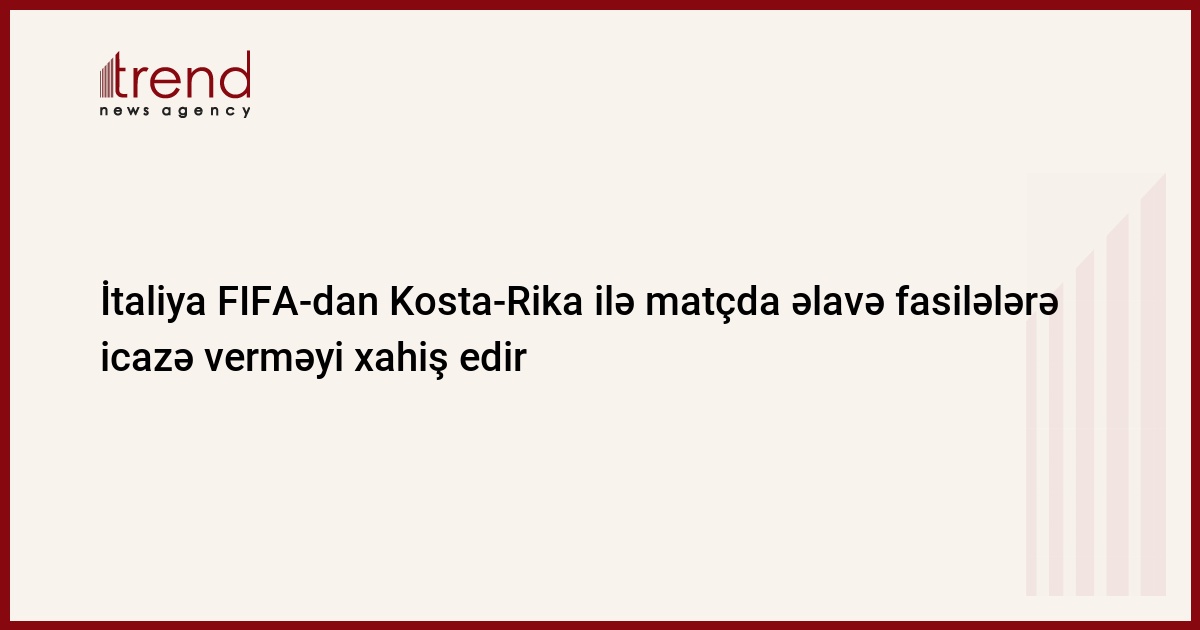 İtaliya yığmasının məşqçi qərargahı Kosta-Rika ilə dünya çempionatının qrup oyununun keçiriləcəyi Resife şəhərində havanın hərarətinin yüksək olmasından narahatdır və cümə günü keçiriləcək oyunda əlavə fasilələr üçün icazə almağa ümid edir. Trend-in məlumatına görə, bu barədə "İnterfaks" agentliyi "Football Italia"ya istinadən xəbər verir.