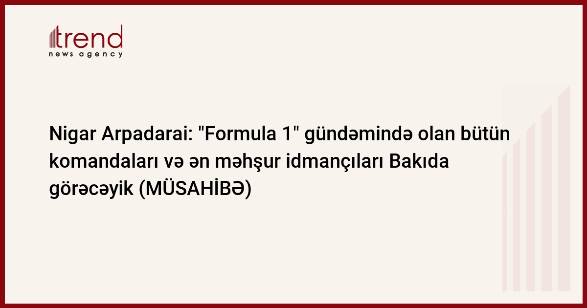 2016-cı ildə ilk dəfə Bakıda keçiriləcək "Formula 1" yarışına hazırlığın hansı vəziyyətdə olmasının maraqlı olduğunu nəzərə alaraq, "Baku Grand Prix" şirkətinin milli mətbuat katibi, Marketinq və kommunikasiya şöbəsinin rəhbəri Nigar Arpadarainin Trend-ə eksklüziv müsahibəsini təqdim edirik.