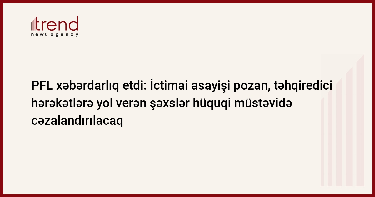 Trend PFL-ə istinadən xəbər verir ki, bəyanatda deyilir ki, ölkə çempionatının keçirilməsinə cavabdeh olan qurum bildirib ki, görüşdən əvvəl və ya sonra, oyun ərzində ictimai asayişi pozan, təhrikedici və təhqiredici hərəkətlərə yol verən şəxslər hüquqi müstəvidə cəzalandırılacaq: "Oyuna gələn şəxslər stadion turniketlərində polislər tərəfindən yoxlanılacaq. Stadiona hər hansı qanunazidd əşyalar, təhqiredici və qıcıq yaradacaq pankartlar, plastik qablar, alışqan keçirtmək qadağandır və qeyd olunanlar polislər tərəfindən alınacaq. Bu kimi halları nəzərə alan PFL oyuna ən azı 2 saat öncədən gəlməyinizi, diqqətli olmağınızı, rəqib azarkeşlərə hörmət etməyinizi xahiş edir. Qarşıda “Neftçi” və “Qarabağ”ı, eləcə də digər komandalarımızı avrokuboklarda ciddi sınaqlar gözləyir. Azarkeşlərimiz məhz bu gündən bir olub, komandalarımızı beynəlxalq miqyasda dəstəkləməlidirlər. Biz nəyə qadir olduğumuzu bir yumruq kimi Avropa meydanlarında göstərməliyik".