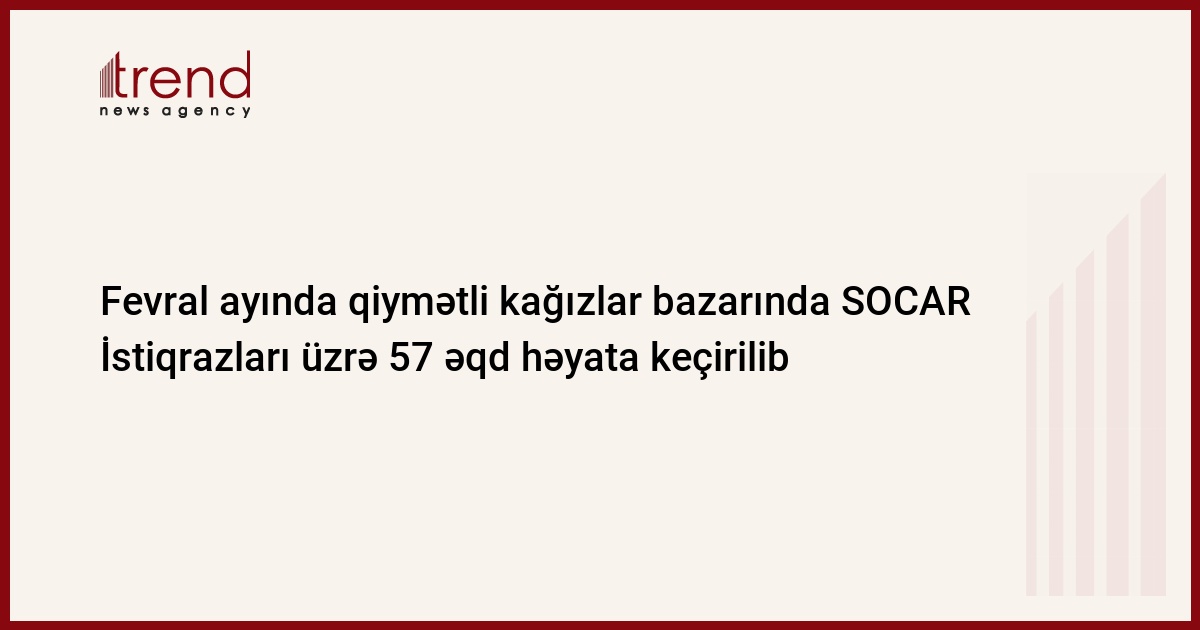 Fevral ayında Azərbaycanın qiymətli kağızlar bazarında SOCAR İstiqrazları üzrə 57 əqd həyata keçirilib və 3 milyon 273 min 757 ABŞ dolları həcmində təkrar bazar əməliyyatı aparılıb.