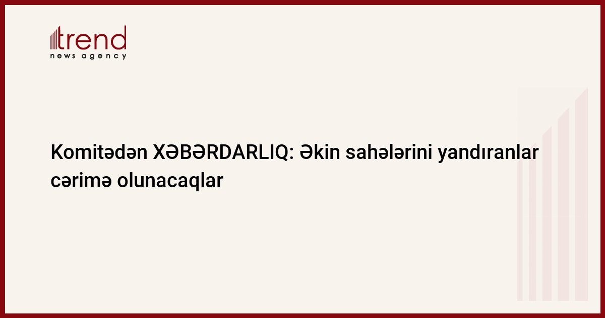 Komitədən Trend-ə verilən məlumata görə, aparılan müşahidələrə əsasən, mövsümi biçin işlərinin başlanması nəzərə alınaraq kənd təsərrüfatı məhsulları əkilmiş, o cümlədən taxıl sahələrinin biçinindən sonra yandırılması halları müşahidə edilir. Əhalinin nəzərinə çatdırılır ki, təsərrüfatlarda kövşənin, yəni məhsulu biçilmiş əkin sahələrinin yandırılması qadağandır və bu işlərə yol vermiş şəxslər cərimələnəcəklər.