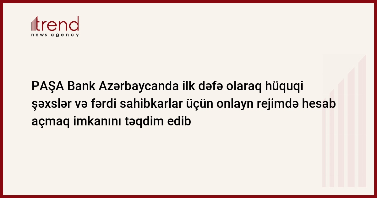 Aktivlərinin həcminə görə ölkənin ən böyük özəl bankı PAŞA Bank Azərbaycanda ilk dəfə olaraq hüquqi şəxslər və fərdi sahibkarlar üçün onlayn rejimdə hesab açmaq imkanını təqdim edilib.