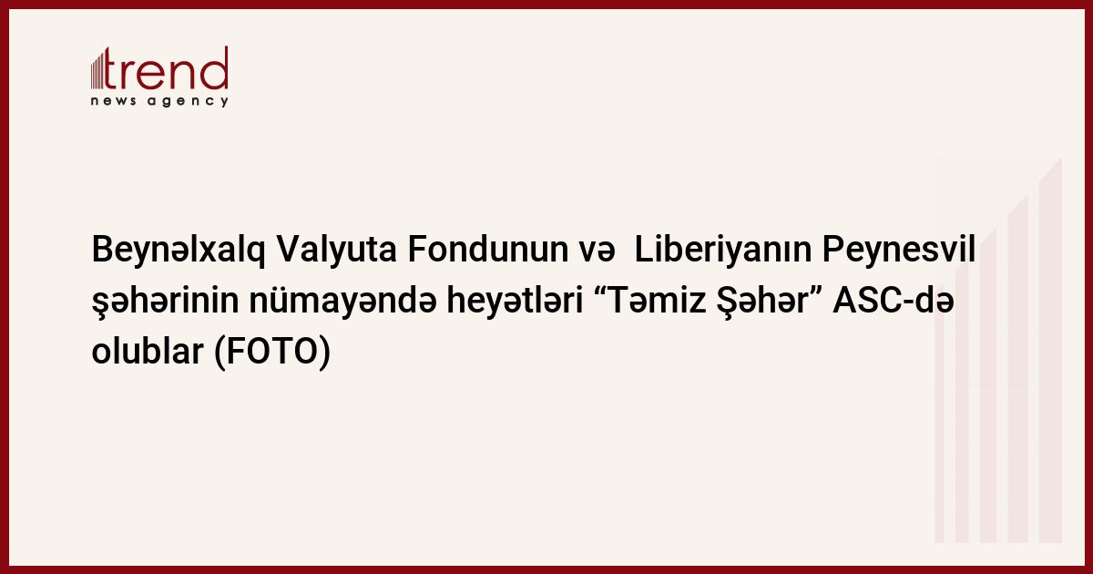 Beynəlxalq Valyuta Fondunun Azərbaycandakı missiyasının rəhbəri Natalya Tamirisanın və Liberiyanın Peynesvil şəhər meri Pem Belçer-Teylorun rəhbərlik etdiyi nümayəndə heyətləri Azərbaycanın tullantıların idarə olunması sahəsində təcrübəsi ilə tanış olmaq üçün “Təmiz Şəhər” ASC-də olublar.