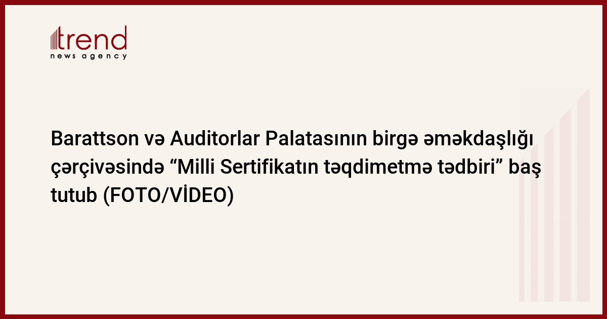 Oktyabrın 13-də "Barattson" və Auditorlar Palatasının birgə əməkdaşlığı çərçivəsində “Milli Sertifikatın təqdimetmə tədbiri” baş tutub. Bu tədbirdə “Beynəlxalq mühasibat uçotunun əsasları” və “Vergi Uçotu” üzrə Milli Sertifikatın öz namizədlərinə təqdim edilib. Tədbirdə Barattson şirkətinin idarə heyətinin sədri Elşən Rəhimov və Auditorlar Palatasının sədri Vahid Novruzov çıxış edərək sonda birgə Milli Sertifikatın öz sahiblərinə təqdim ediblər.
