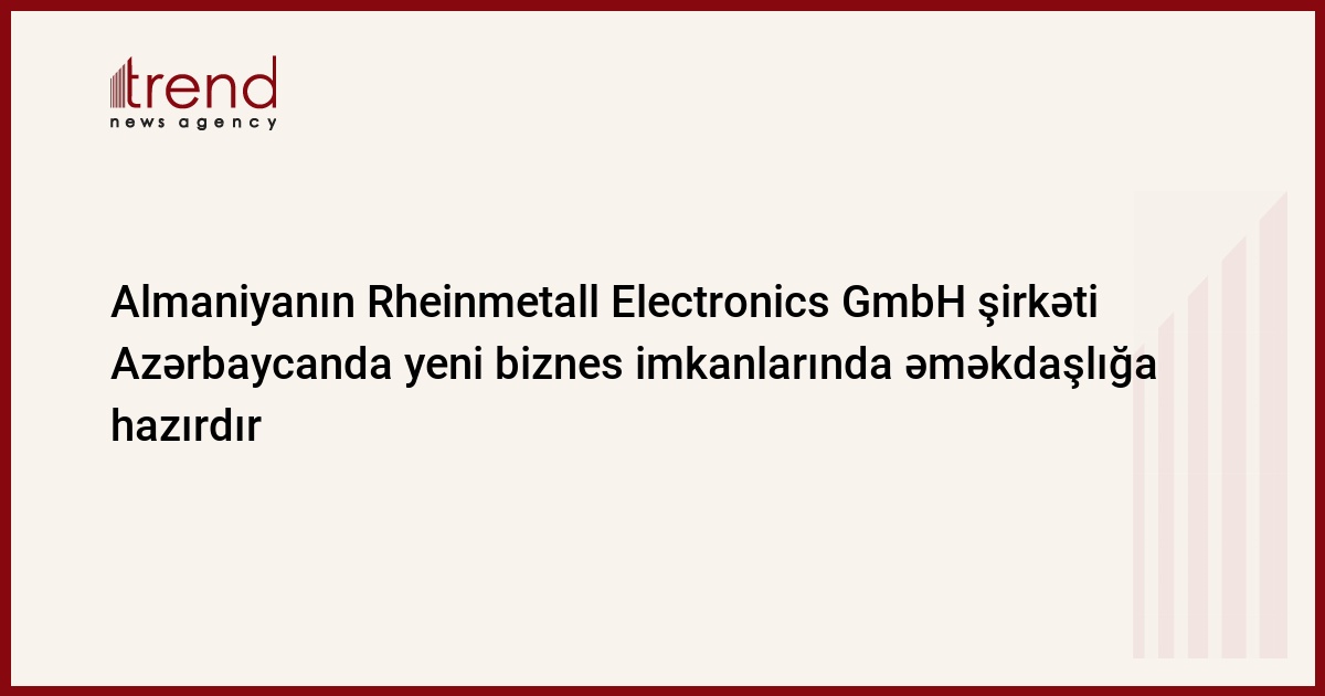 2-4 dekabr 2019-cu il tarixlərində Alman-Azərbaycan Xarici Ticarət Palatası (AHK Azərbaycan) Almaniyanın Rheinmetall Electronics GmbH şirkətinin Azərbaycana işgüzar səfərini təşkil edib.