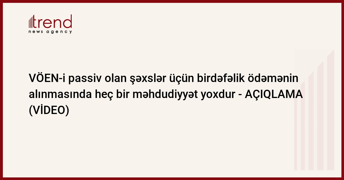 Nazirlər Kabinetinin 127№-li 7 aprel 2020-ci il tarixli Qərarı ilə təsdiq edilmiş "Koronavirus (COVID-19) pandemiyası dövründə xüsusi karantin rejiminin tətbiq olunması ilə əlaqədar işsiz kimi qeydiyyatda olan şəxslərə birdəfəlik ödəmənin verilməsi şərtləri və qaydası"na əsasən, birdəfəlik sosial yardımdan imtina olunmasının bəzi şərtləri mövcuddur ki, bunlardan biri şəxsin, yaxud onun əri və ya arvadının sahibkar kimi aktiv VÖEN-ə sahib olmasıdır. Başqa sözlə, fəaliyyəti dayandırılmış (VÖEN-i passiv olan) şəxslər üçün birdəfəlik ödəmənin alınmasında heç bir məhdudiyyət yoxdur. Fəaliyyətini dayandırmış, yəni VÖEN-i passiv olan fiziki şəxslər birdəfəlik ödəmənin alınması üçün müvafiq qaydada Əmək və Əhalinin Sosial Müdafiəsi Nazirliyinə müraciət edə bilərlər.