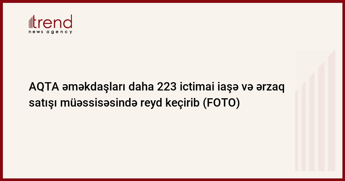 AQTA-dan Trend-ə verilən məlumata görə, agentlik əməkdaşları tərəfindən Bakıda, eləcə də regionlarda fəaliyyət göstərən 35 ictimai iaşə obyekti, 188 ərzaq satışı mağazası olmaqla ümumilikdə 223 müəssisədə reyd keçirilib. Sahibkarlıq subyektlərinə qida təhlükəsizliyi sahəsində qanunvericiliyin tələbləri izah edilib, icrası məcburi göstərişlər və maarifləndirici tövsiyələr verilib.