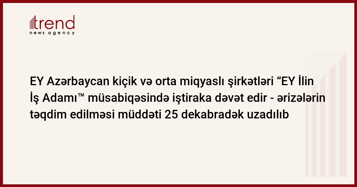 EY Azərbaycan kiçik və orta miqyaslı şirkətləri “EY İlin İş Adamı™” 2020-2021 müsabiqəsində iştiraka dəvət edir - namizədlik üçün ərizələrin təqdim edilməsi müddəti 25 dekabr 2020-ci il tarixinədək uzadılıb.