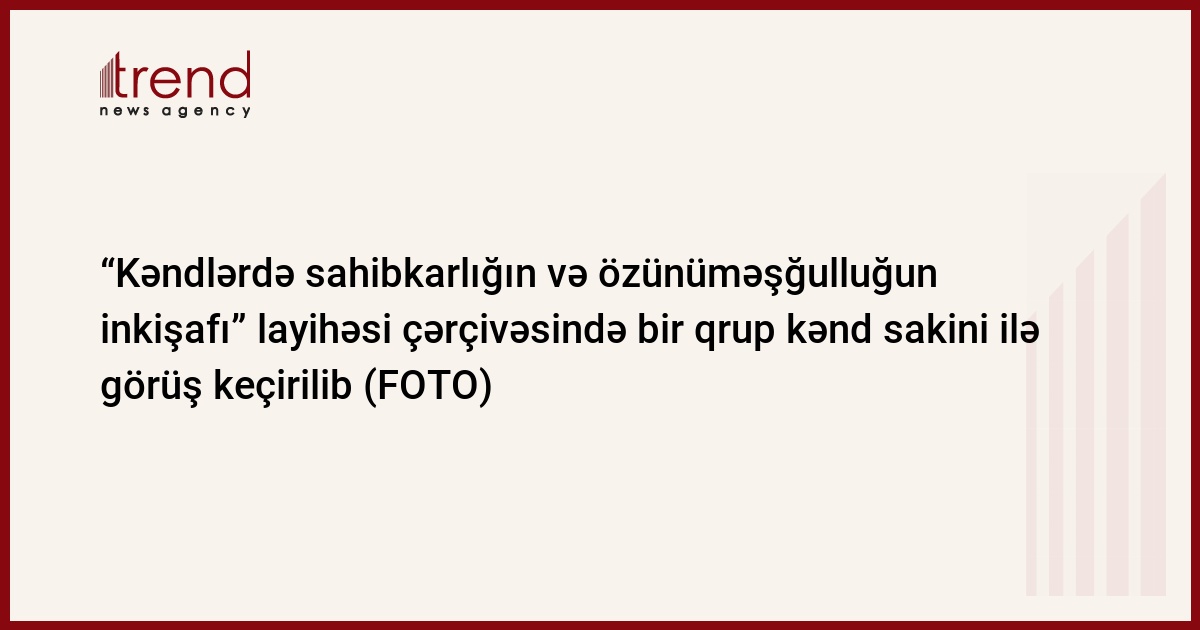 İctimai Birlikdən Trend-ə verilən məlumata görə, layihənin əsas məqsədi kəndlərdə sahibkarlığın inkişafına, məşğulluğa və əhalinin rifah halının yaxşılaşdırılmasına dəstək olmaqdır. Layihə çərçivəsində İsmayıllı rayonunun Buynuz və Xanəgah kəndlərinin bir qrup sakini ilə görüş keçirilib. Belə ki, layihənin məlumatlandırma mərhələsində hər iki kəndin 300 nəfərə yaxın kənd əhalisi layihə haqqında məlumatlandırılıb və layihədə iştirak üçün seçim meyarlarına uyğun 50 nəfərə yaxın kənd sakini müraciət edib. Müraciət edən şəxslərlə kiçik qruplarda görüşlər keçirilir, onlara layihənin gedişatı və s. haqqında