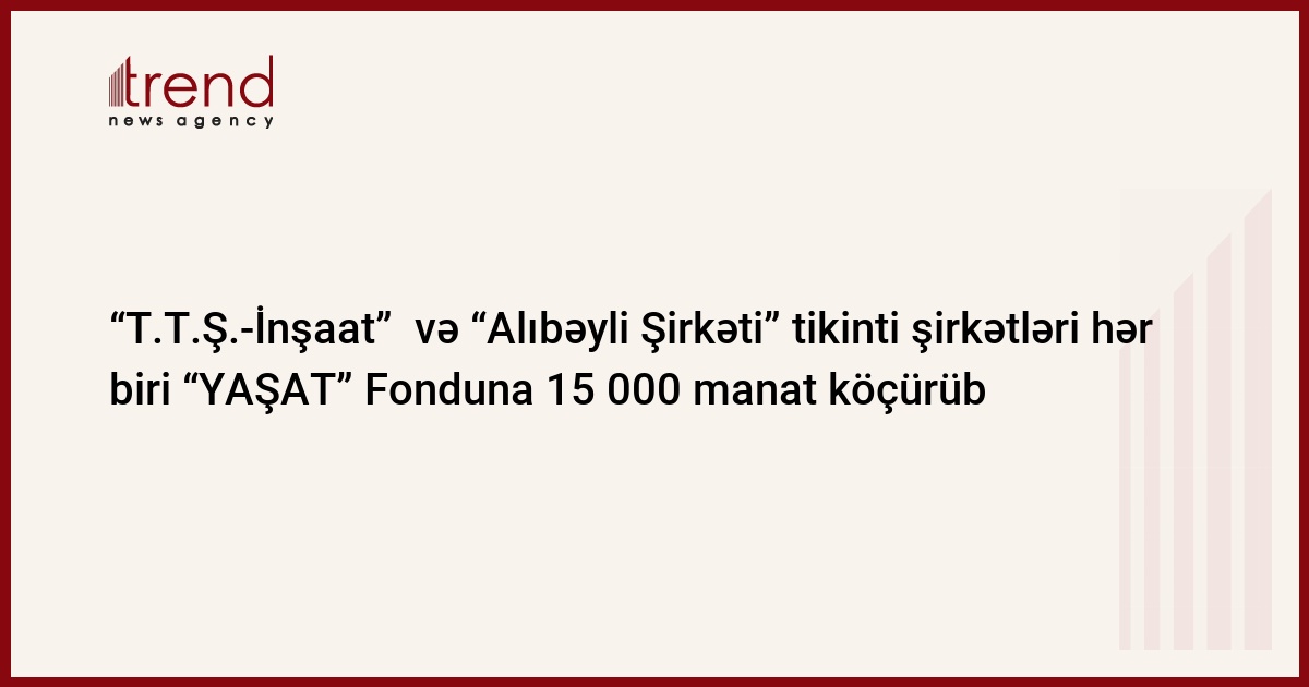 Azərbaycanda fəaliyyət göstərən və hər zaman xeyriyyə kampaniyalarına qoşulan “T.T.Ş.-İnşaat” MMC və “Alıbəyli Şirkəti” MMC tikinti şirkətləri bu dəfə də xeyriyyə tədbirlərini davam etdirib. Adıçəkilən şirkətlərin hər biri “YAŞAT” Fondunun hesabına yardım məqsədilə 15 000 manat məbləğində vəsait köçürüb.