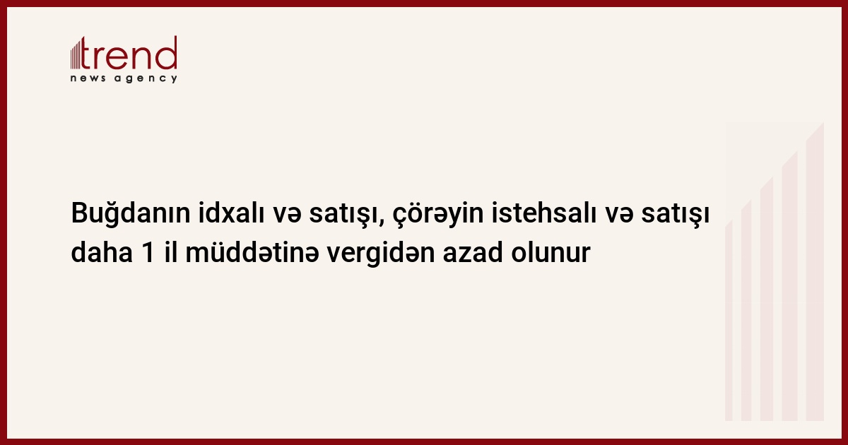 Azərbaycanda buğdanın idxalı və satışı, buğda ununun və çörəyin istehsalı və satışı daha 1 il müddətinə vergidən azad olunur.