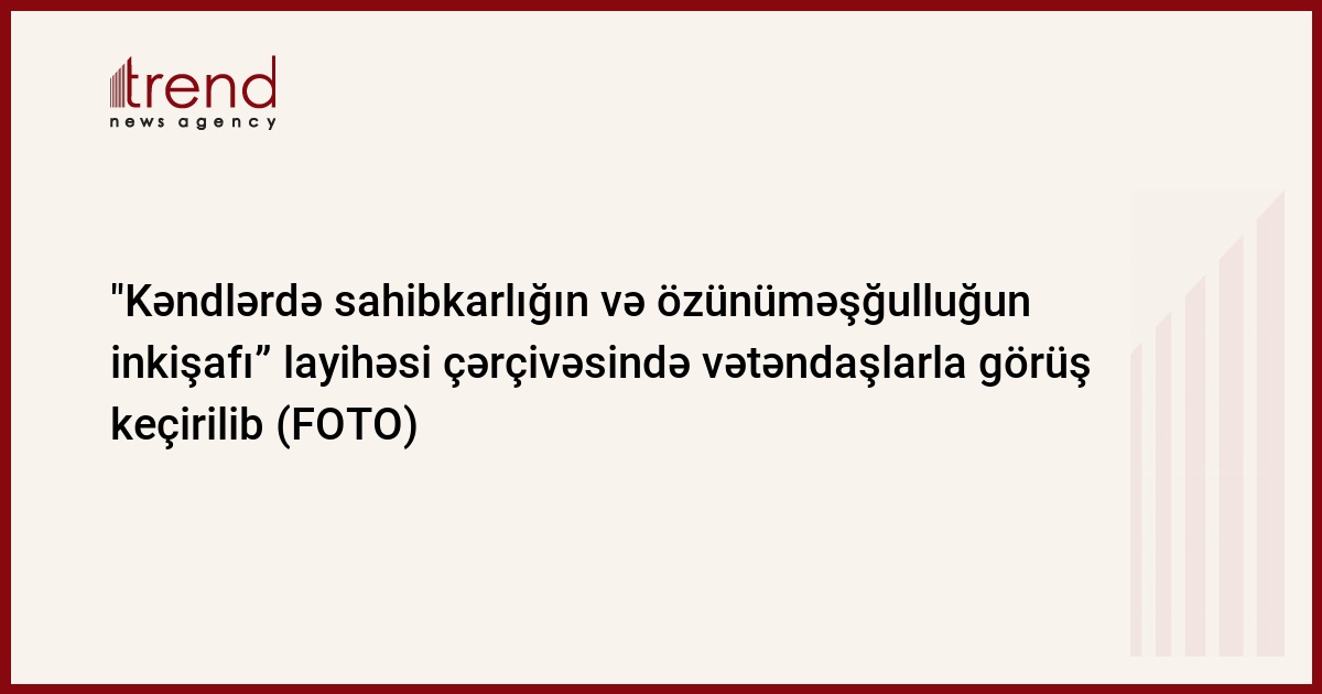 "Kəndlərdə sahibkarlığın və özünüməşğulluğun inkişafı” layihəsi uğurla davam edir və layihə çərçivəsində gələcək sahibkarlarla görüşlər keçirilir. Ggörüşlərin əsas məqsədi vətəndaşların layihə ilə bağlı suallarını cavablandırmaq, gələcəkdə sahibkarlıq subyekti kimi istifadə olunacaq ərazilərin təmir və avadanlıq ehtiyaclarını müəyyən edilməsidir.