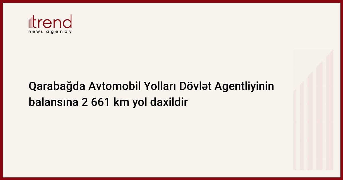 Hazırda Qarabağ ərazisində Azərbaycan Avtomobil Yolları Dövlət Agentliyinin balansına 2 661 km yol daxildir. İşğaldan azad edilmiş ərazilərdəki körpülərin sayı isə 90-dır.
