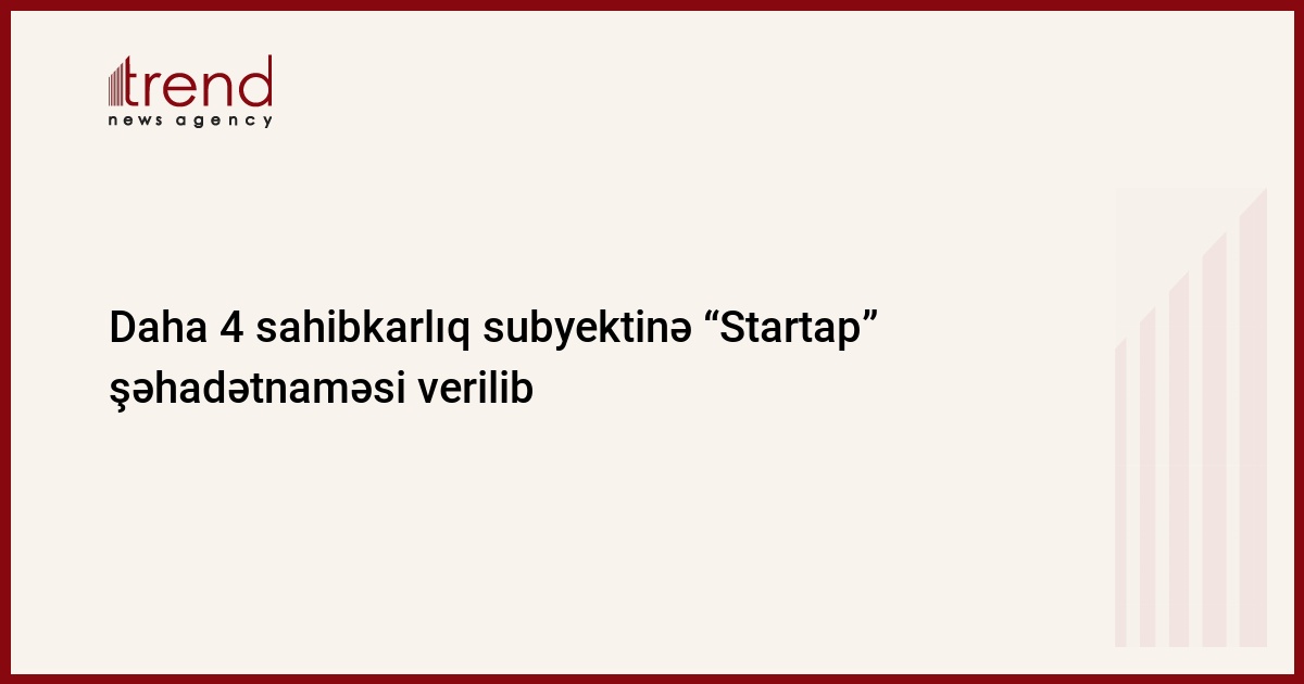 Kiçik və Orta Biznesin İnkişafı Agentliyi (KOBİA) tərəfindən daha 4 sahibkarlıq subyektinə “Startap” şəhadətnaməsi verilib. Bunlar "VATT" MMC-nin telefonlar üçün şarj cihazlarının mobil tətbiq vasitəsilə icarəsinə dair “Powerbank rental” layihəsi, "ALT SERVİCE" MMC-nin fasiləsiz elektrik enerjisi üçün “Ağıllı şəbəkə cihazı”, fərdi sahibkar Təbriz Zeynalovun məişət xidmətlərinin alqı-satqısı üzrə “www.cagir.az” onlayn platforması və "TECHFİN" MMC-nin bulud tipli onlayn mühasibatlıq proqramı olan “www.hesabat.az” layihəsidir.