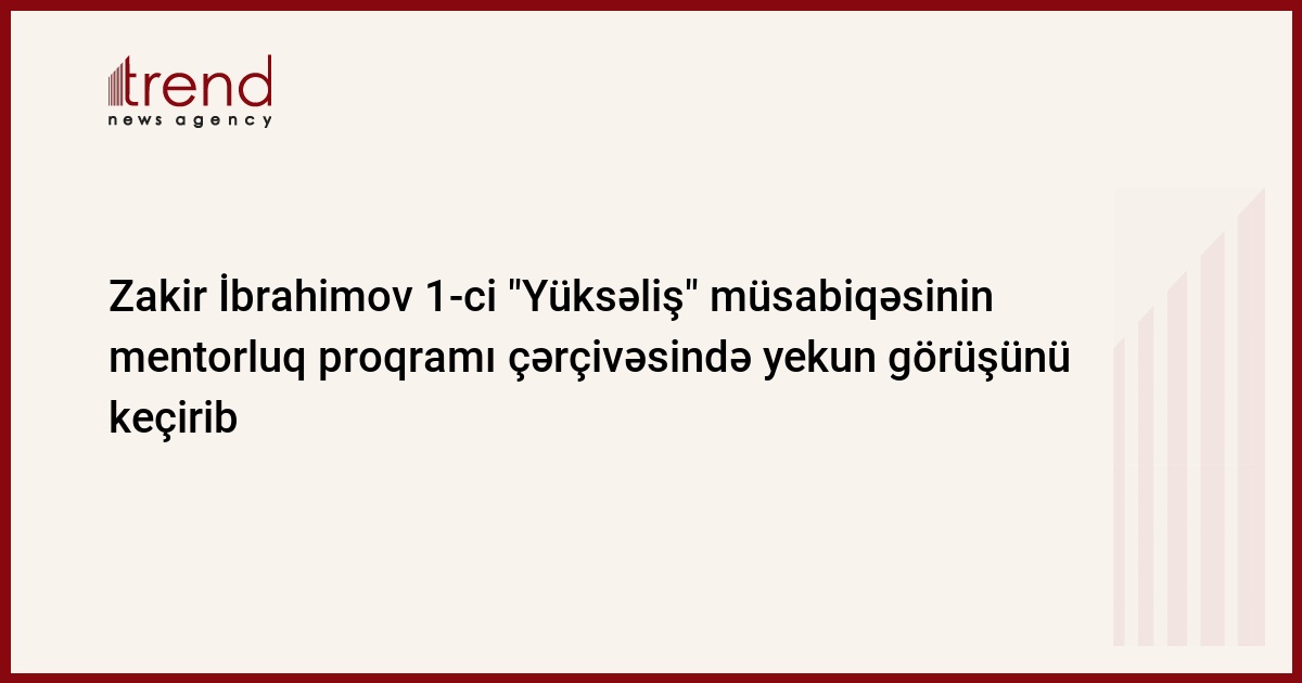 “AzerGold” Qapalı Səhmdar Cəmiyyətinin (QSC) İdarə Heyətinin sədri Zakir İbrahimov 1-ci “Yüksəliş” müsabiqəsinin mentorluq proqramı çərçivəsində layihə qaliblərindən olan Nazim Novruzovla yekun görüşünü keçirib.