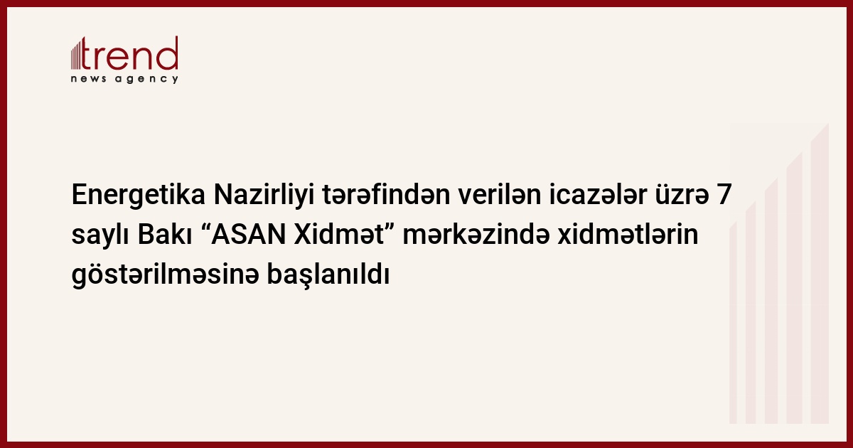 Nazirlikdən Trend-ə verilən məlumata görə, “Azərbaycan Respublikasinin Prezidenti yanında Vətəndaşlara Xidmət və Sosial İnnovasiyalar üzrə Dövlət Agentliyinin fəaliyyətinin təmin edilməsi haqqında" Azərbaycan Respublikasi Prezidentinin 2012-ci il 5 sentyabr tarixli 706 nömrəli Fərmanının 5.21-ci bəndinə uyğun olaraq, 2023-cü ilin 4 sentyabr tarixindən Energetika Nazirliyi tərəfindən verilən icazələr üzrə 7 saylı Bakı “ASAN Xidmət” mərkəzində müvafiq xidmətlərin göstərilməsinə başlanılıb.