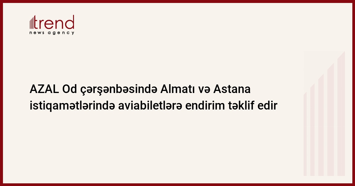 Azərbaycanın milli aviadaşıyıcısı AZAL Novruz bayramı ərəfəsində növbəti endirim aksiyasına start verir. Aviaşirkət Novruz çərşənbələrindən biri olan Od çərşənbəsində Almatı və Astana istiqamətləri üzrə aviabiletlərə endirim təklif edir.