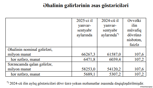 İlkin məlumatlara görə, 2025-ci ilin yanvar-sentyabr aylarında ölkə əhalisinin nominal gəlirləri əvvəlki ilin eyni dövrü ilə müqayisədə 7,6 faiz artaraq 66267,3 milyon manat və ya hər nəfərə orta hesabla 6471,8 manat olub.