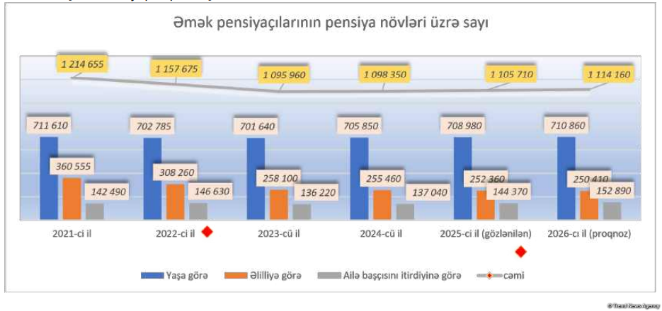 2026-cı ildə əmək pensiyalarının ödənişi üzrə xərclərin proqnoz göstəricisi (cəmi 7992,88 mln. manat) 2025-ci ilin təsdiq edilmiş proqnoz göstəricisinə nisbətən 10,85 faiz və ya 782,35 mln. manat çox nəzərdə tutulur.