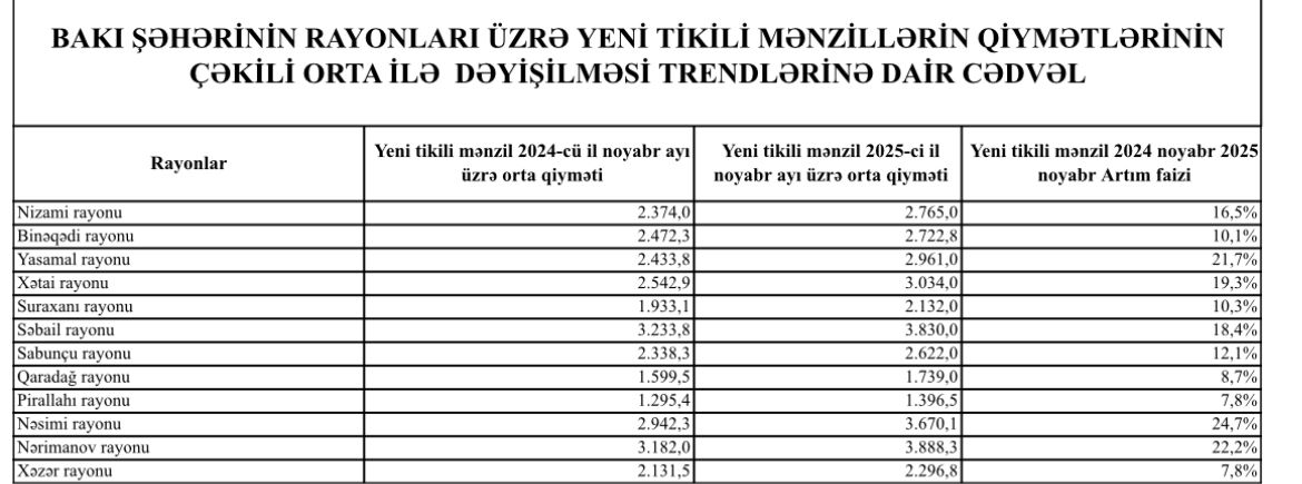 Cari ilin noyabr ayında Bakının bütün rayonlarında yeni tikili mənzillərin qiymətlərində ötən ilin eyni dövrü ilə müqayisədə artım müşahidə edilib.