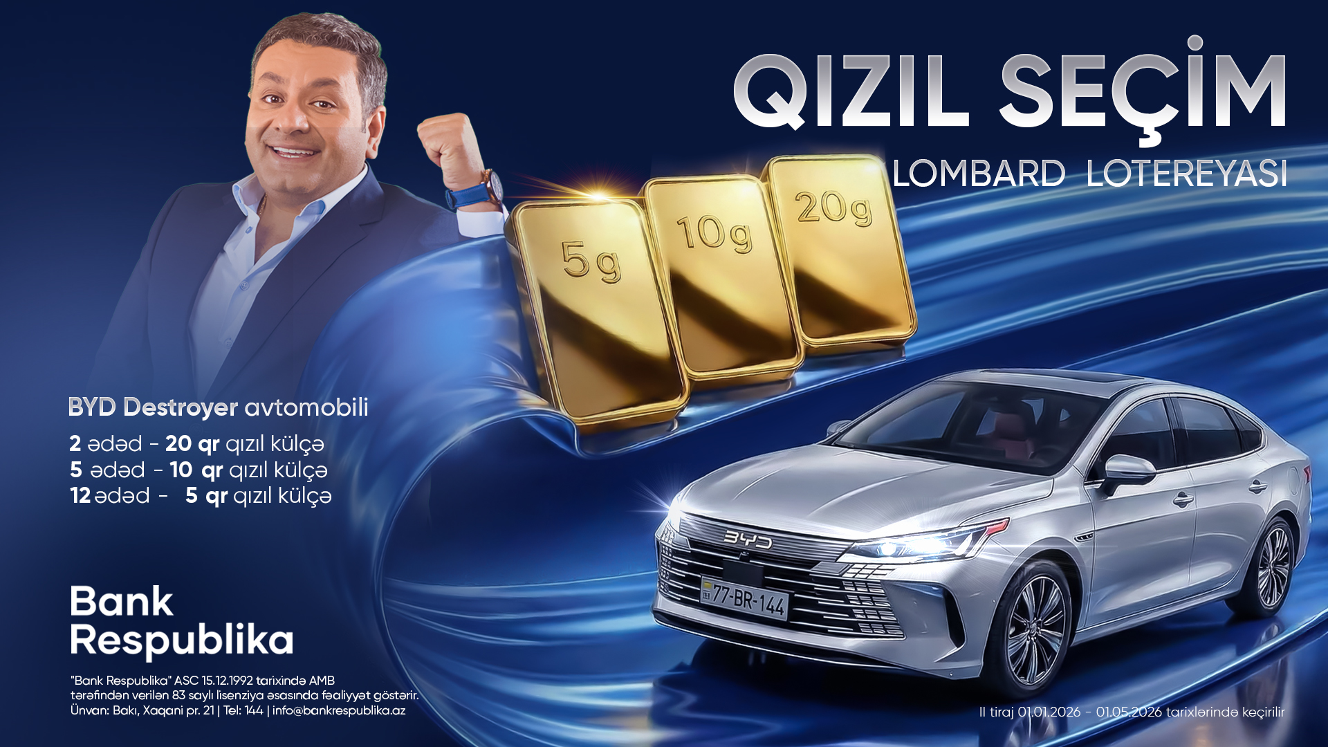 Əgər siz də sərfəli şərtlərlə kredit götürüb, həm avtomobil, həm də qızıl külçə qazanmaq şansını qaçırmaq istəmirsinizsə – düzgün seçim edin, qalib olun!