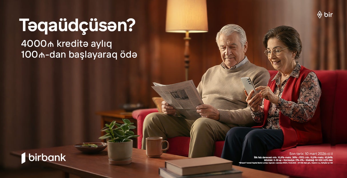Birbank təqaüdçülər üçün maliyyə rahatlığını artıran yeni fürsət təqdim edir. Belə ki, bankdan təqaüd alan şəxslərə özəl sərfəli nağd kredit kampaniyasına start verilir. Kampaniya çərçivəsində müştərilər “Gündəlik tələbat krediti” üzrə 3%-dək endirimdən yararlanaraq hər 4000 AZN kredit üçün aylıq cəmi 100 AZN-dən başlayan ödəniş imkanı əldə edirlər. Xüsusi təklif 11 fevral – 10 mart tarixlərində keçərlidir.
