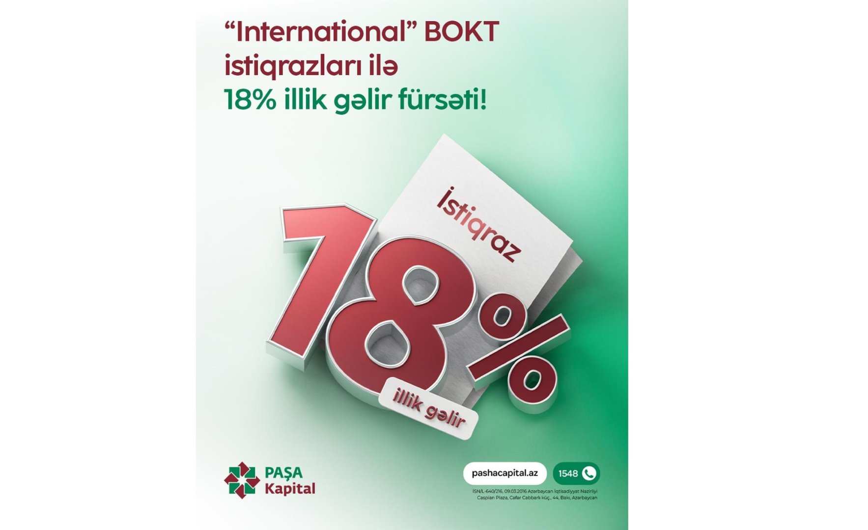 Ölkənin aparıcı investisiya şirkəti PAŞA Kapital, investorlara yüksək gəlir qazandıran yeni maliyyə aləti - "INTERNATIONAL" Bank Olmayan Kredit Təşkilatının 1 milyon AZN həcmində istiqrazlarının yerləşdirilməsini elan edir.