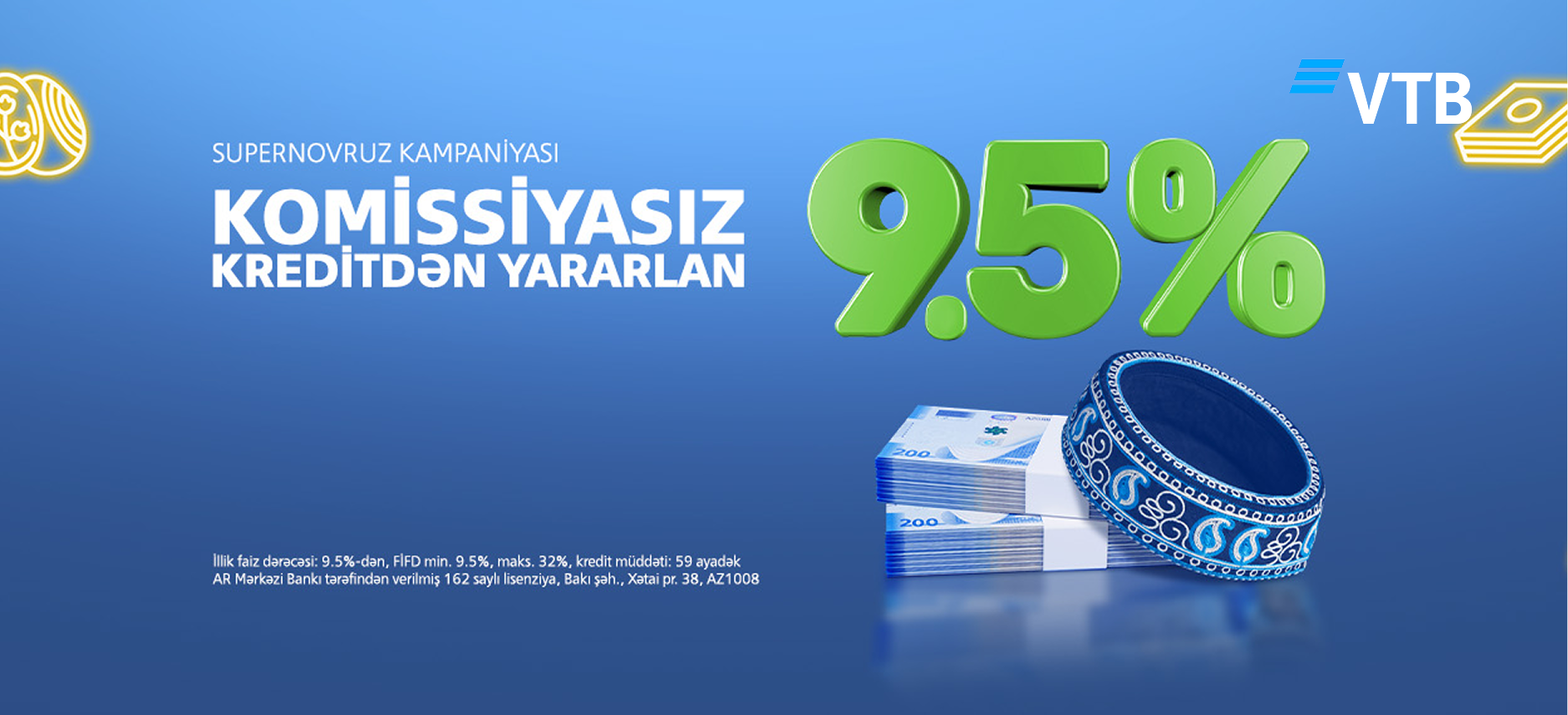 "VTB" (Azərbaycan) Novruz bayramı ərəfəsində müştərilər üçün sərfəli kredit kampaniyasına start verib. Kampaniya çərçivəsində nağd kreditləri illik 9,5%-dən başlayan faiz dərəcəsi və 0% komissiya ilə əldə etmək mümkündür. Təklif 24 fevral – 31 mart tarixləri arasında qüvvədədir.