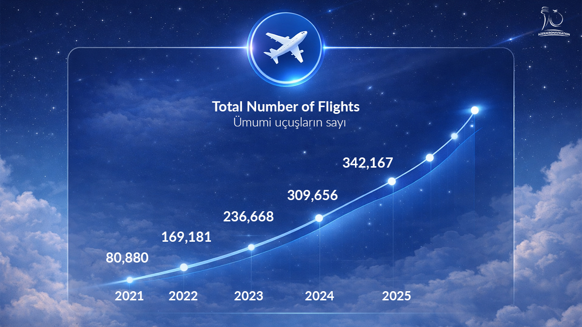Bu tendensiya son illərin statistik göstəricilərində də aydın şəkildə əks olunur. Belə ki, 2021-ci ildə 80 880 olan uçuş sayı 2025-ci ildə 342 167-yə çataraq ölkənin qlobal hava nəqliyyatı sistemində rolunun nəzərəçarpacaq dərəcədə genişləndiyini nümayiş etdirir.
