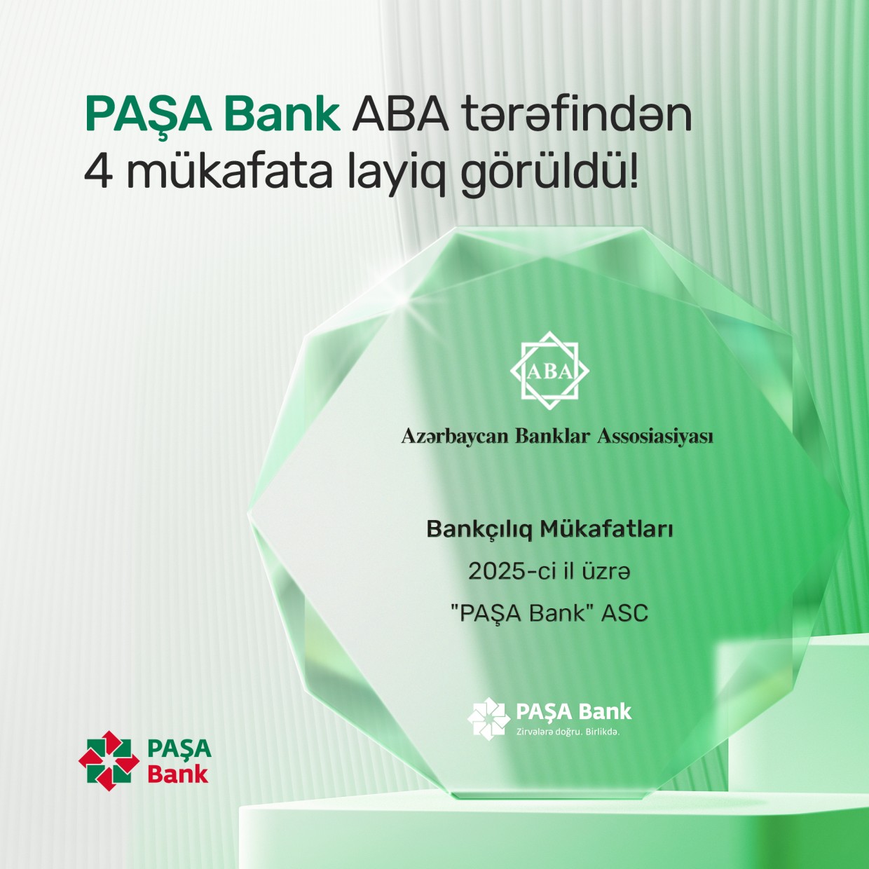 Ölkədə bank sektorunun iştirakçıları arasında keçirilən müsabiqədə maliyyə institutlarının 2025-ci il üzrə fəaliyyət nəticələri qiymətləndirilib. Assosiasiyanın ekspertləri tərəfindən verilən qərara əsasən "PAŞA Bank" 4 istiqamət üzrə nüfuzlu mükafata layiq görülüb. Belə ki, Bank, “Korporativ sosial məsuliyyət", “Beynəlxalq əməkdaşlığın inkişafında fərqlənən bank”, “Kiçik və Orta Biznesin maliyyə əlçatanlığının artırılması ilə əlaqədar tədbirlər keçirmiş ABA üzvü”,"Rəqəmsal ödənişlər sahəsində innovativ layihələrin tətbiqi” istiqamətləri üzrə qalib elan olunub.