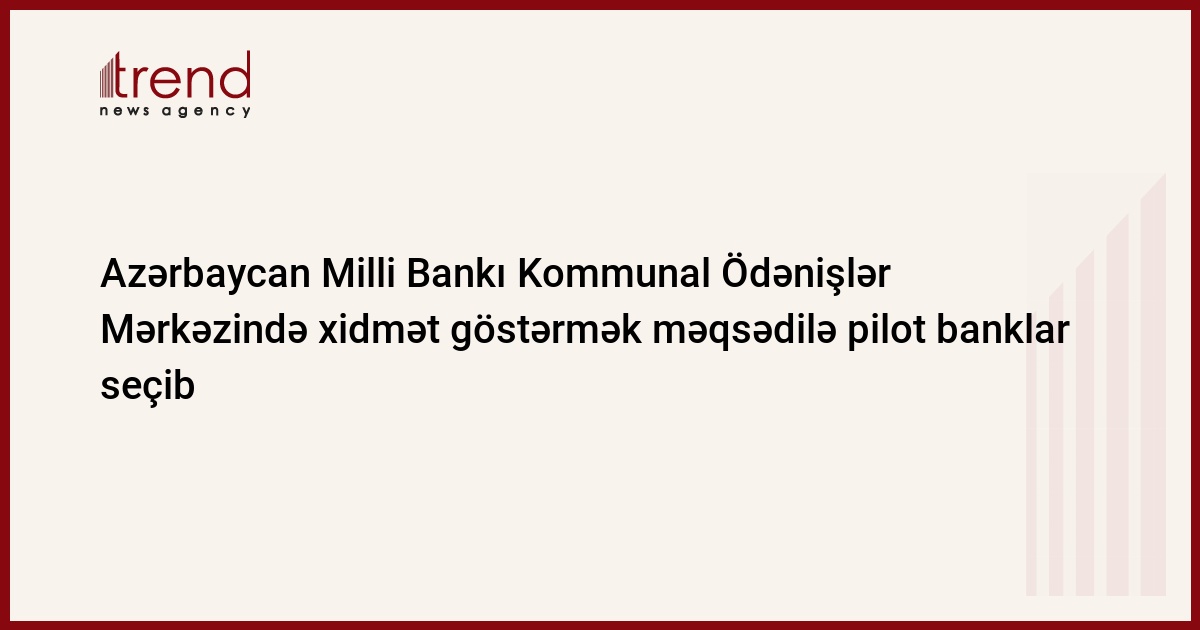 Azərbaycan, Bakı / Trend müxbir İ.Xəlilova / Azərbaycan Milli Bankı (AMB) Kommunal Ödənişlər Mərkəzinin işinin təsdiq olunması məqsədilə 10 pilot bank seçib. Bu barədə pilot banklardan birindən verilən məlumatda deyilir. Bu banklara Azərbaycan Beynlxalq Bankı, "Kapital Bank", "Azərdəmiryolbank", "Bank of Baku", "Ata Bank", "Rabitə Bank" və s. aiddir.