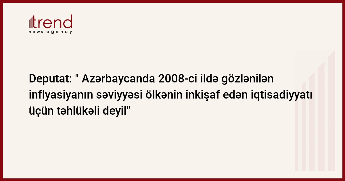 Azərbaycan, Bakı/ Trend , müxbir Ü.İsmayılova/ Azərbaycanda 2008-ci ildə 13 faiz səviyyəsində gözlənilən inflyasiya ölkənin inkişaf edən iqitisadiyyatı üçün təhlükəli deyil. Bu barədə çərşənbə günü iqtisadi siyasət üzrə parlament komissiyasının sədr müavini Azər Əmiraslanov bildirib.