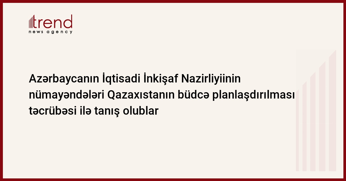 Azərbaycan, Bakı/ Trend / Qazaxıstanın iqtisadi və büdcə planlaşdırılması təcrübəsi ilə tanış olmaq məqsədilə, iqtisadi inkişaf nazirinin müavini Sevinc Həsənovanın başçılıq etdiyi nümayəndə heyəti bu ölkədə işgüzar səfərdə olub.Bu barədə Nazirliyin məlumatında göstərilib.