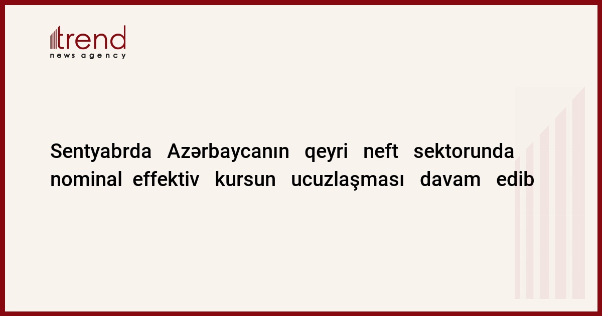 Azərbaycan , Bakı / Trend müxbir İ.Xəlilova / Azərbaycan milli bankı keçən ilin dekabr ayı ilə müqayisədə bu ilin sentyabr ayında manatın nominal effektiv kursunun (NEK) Azərbaycanın ticarət partnyorlarının valyutalarına qarşı ucuzlaşma templərininin sürətlənməsini təstiqləyir . Bu barədə AMB-dən bildiriblər . Ümumi ticarət dövriyyəsində kurs 2,2 faiz , importda 1,9 faiz , eksportda isə 2,3 faiz şağı düşüb . 2006-cı ilin analoji dövrü ilə müqayisədə NEK ümumi ticarət dövriyyəsində 4 faiz , eksportda 4,4 faiz , importda isə 3,2 faiz ucuzlaşıb .
