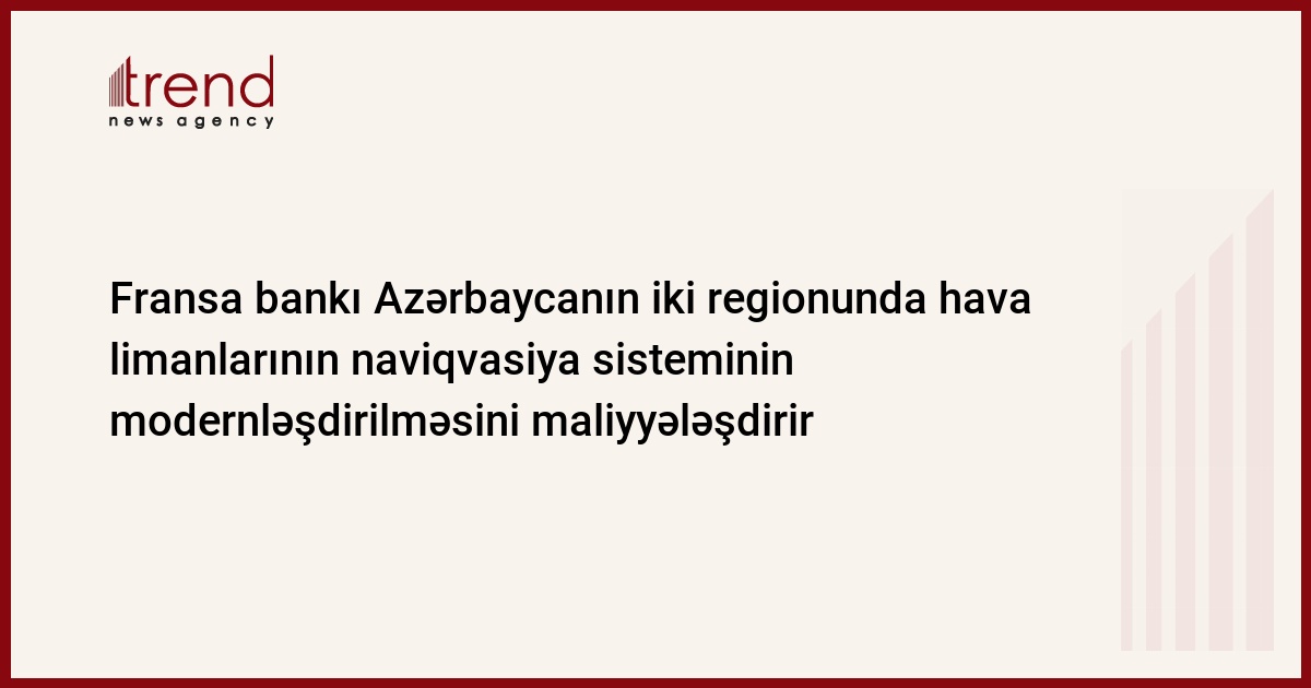 Azərbaycan, Bakı / Trend , müxbir İ.Xəlilova / Cümə axşamı ölkənin iqtisadi inkişaf nazirliyindən verilən məlumata görə, Fransanın "Nateksis" Bankı "Gəncə şəhəri və Naxçıvan Muxtar Respublikasında hava limanlarının aeronaviqasiya sisteminin modernləşdirilməsi" Layihəsi çərçivəsində Azərbaycan Hökumətinə 14, 88 milyon avro məbləğində kredit ayıracaq.