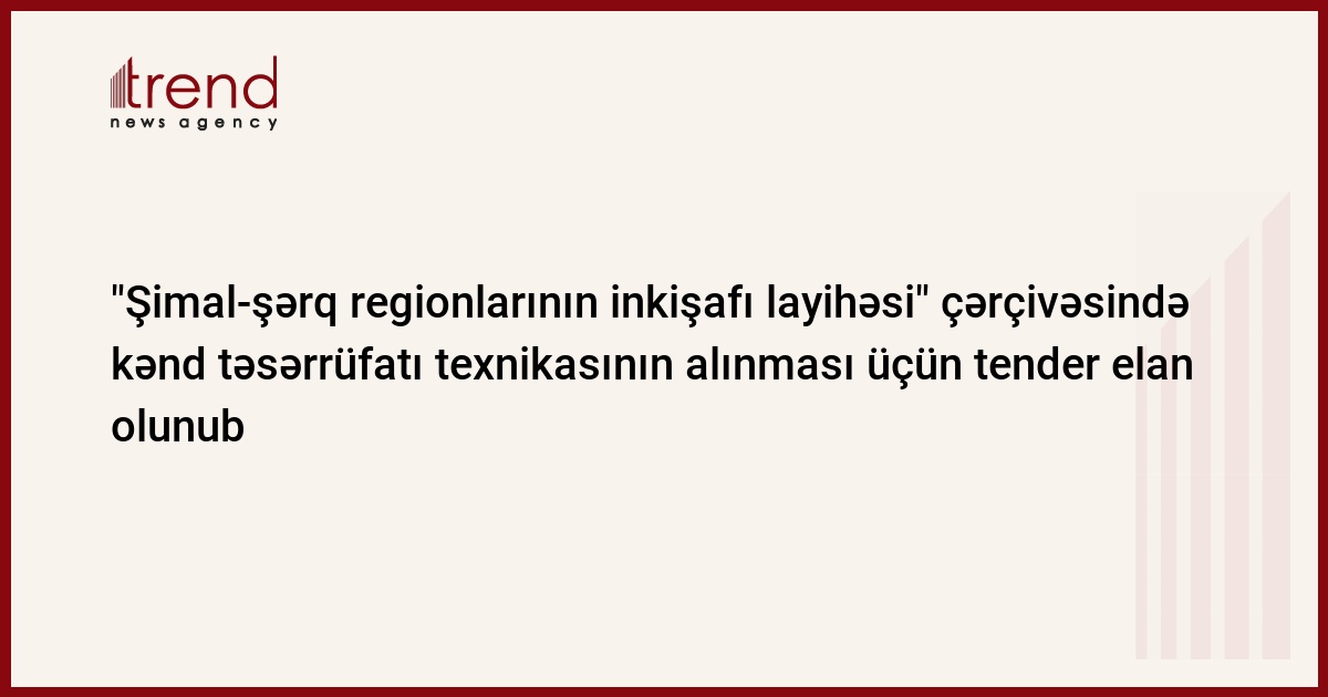 Azərbaycan, Bakı, 1 fevral / Trend / Azərbaycanın Kənd Təsərrüfatı Nazirliyi yanında kənd təsərrüfatı kreditləri üzrə Dövlət Agentliyi "Şimal-şəqr regionlarının inkişafı layihəsi" çərçivəsində kənd təsərrüfatı texnikasının alınması üçün tender elan edib.