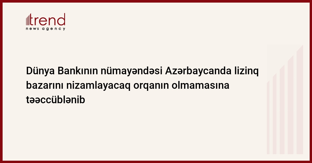 Azərbaycan, Bakı, 21 fevral / " müxbir Ü.İsmayılova / DB-nin "Azərbaycanın maliyyə sisteminin müasirləşdirilməsi" yeni layihəsinin rəhbəri Maykl Edvards, Azərbaycanda ölkənin lizinq bazarını nizamlayacaq xüsusi orqanın olmamasına təəccüblənib, - cümə axşamı Azərbaycan Lizinq şirkətləri Assosiasiyasının (ALŞA) idarə heyətinin sərdi Azər Məmmədov