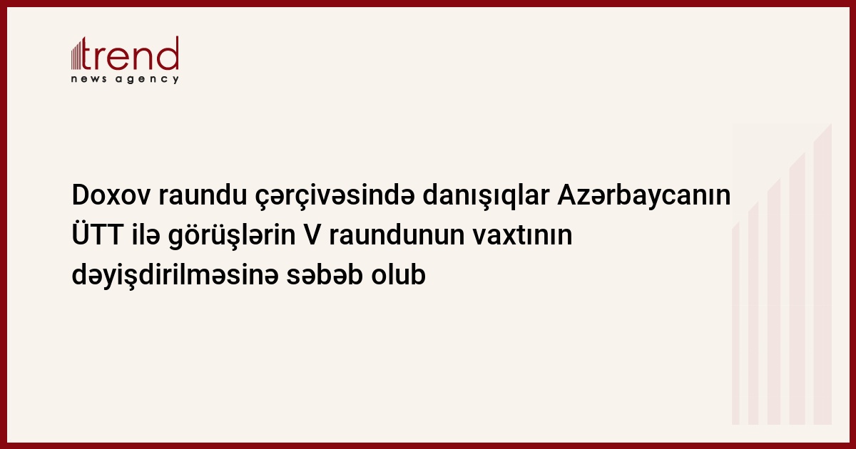 Azərbaycan, Bakı, 26 fevral / " müxbir İ.Xəlilova / Doxov raundunda danışıqların müsbət tendensiyasına görə, Ümumdünya Ticarət Təşkilatı (ÜTT) ÜTT-yə daxil olmaq üçün namizəd ölkələrlə görüşləri təxirə salıb, bu da Azərbaycan hökumətinin İşçi Qrupu ilə danışıqların beşinci raundunun başqa vaxta keçirilməsinə səbəb olub, - çərşənbə axşamı danışıqlar qrupunun başçısı, AR xarici işlər nazirinin müavini Mahmud Məmmədquliyev deyib.