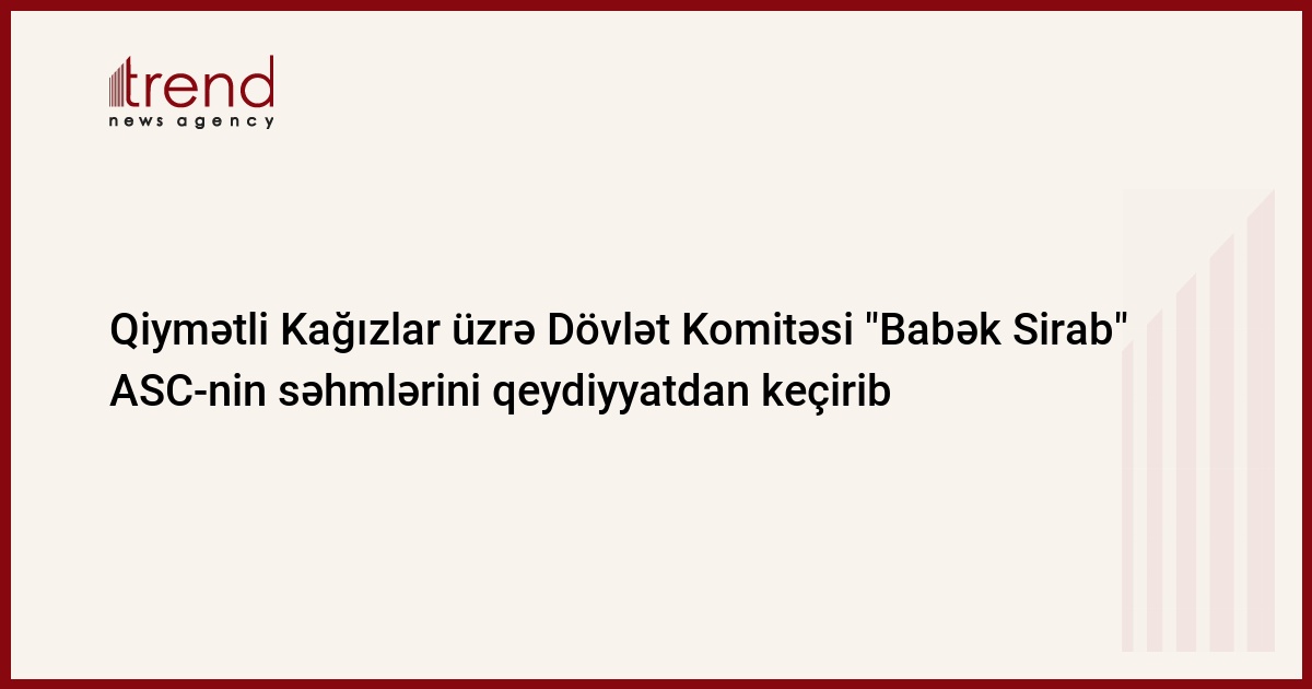 Azərbaycan, Bakı, 07 mart / " "/ Qiymətli Kağızlar üzrə Dövlət Komitəsi tərəfindən "Babək Sirab" ASC-nin adi adlı sənədsiz səhmlərinin emissiya prospekti qeydə alınıb,- Dövlət Komitəsindən verilən məlumatda deyilir.