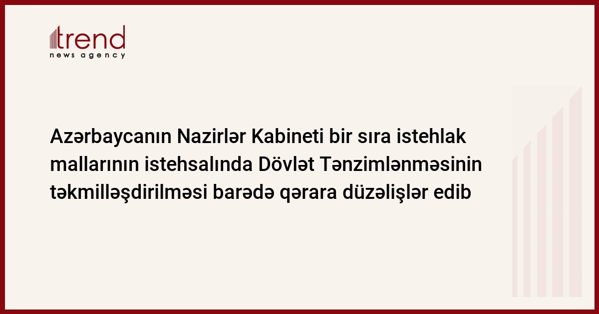 Azərbaycan, Bakı, 21 aprel/ Trend / Azərbaycanın Nazirlər Kabineti prezidentin "Bəzi istehlak mallarının istehsalı və dövriyyəsi ilə bağlı dövlət tənzimlənməsinin təkmilləşdirilməsi sahəsində əlavə tədbirlər haqqında" fərmanının icrası barədə 2005-ci ilin dekabrında qəbul edilmiş qərara düzəlişlər edib.