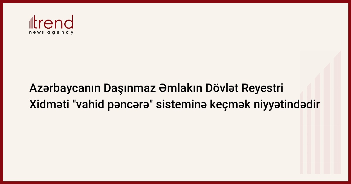 Azərbaycan, Bakı, 08 may/ Trend , müxbir Ü.İsmayılova/ Azərbaycanın Azərbaycanın Daşınmaz Əmlakın Dövlət Reyestri Xidməti "vahid pəncərə" sisteminə keçmək niyyətindədir. Bu barədə cümə axşamı Dövlət Xidmətinin rəhbəri Arif Qaraşov məlumat verib.