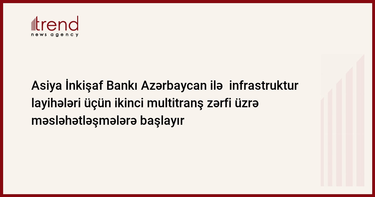 Azərbaycan, Bakı, 12 may / Trend , müxbir İ.Xəlilova/ Asiya İnkişaf Bankı (AİB) Azərbaycan hökuməti ilə dəmir yol infrastrukturunun təkmilləşdirilməsi üçün 550 mln. dolların verilmə mümkünlüyü üzrə müzakirələrə başlayır. Bu barədə bazar ertəsi bankın Bakı nümayəndəliyindən məlumat verilib. Bu vəsaitin bir zərfdə bir neçə layihənin toplanmasını nəzərdə tutan Multitranche Financing Facility (MFF) mexanizm çərçivəsində ayrılması güman olunur.